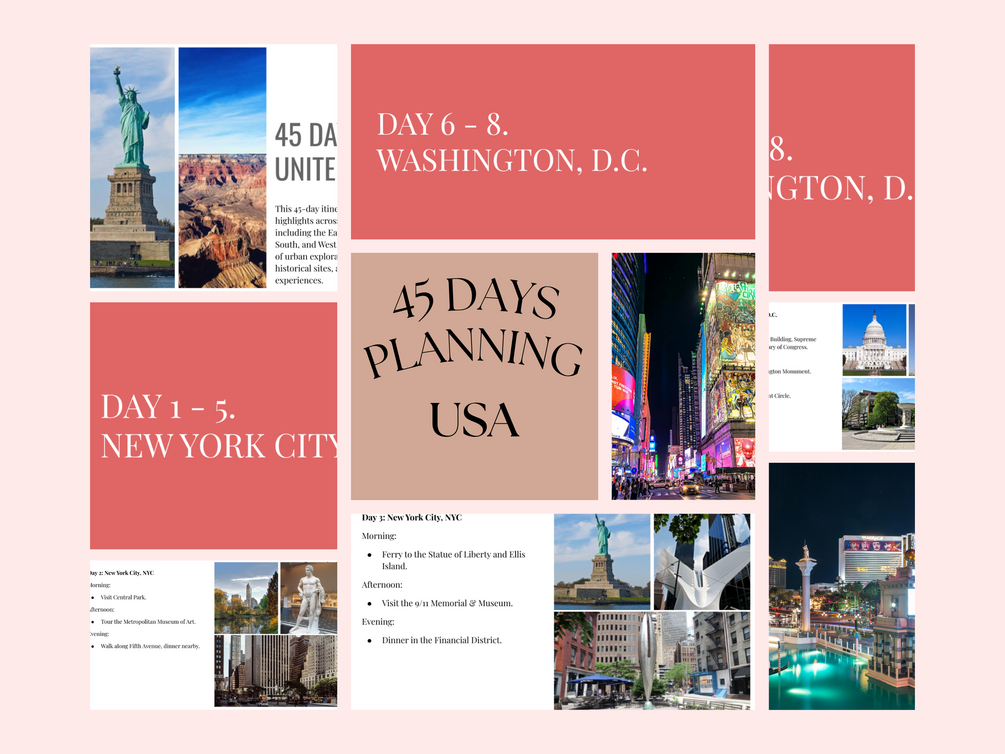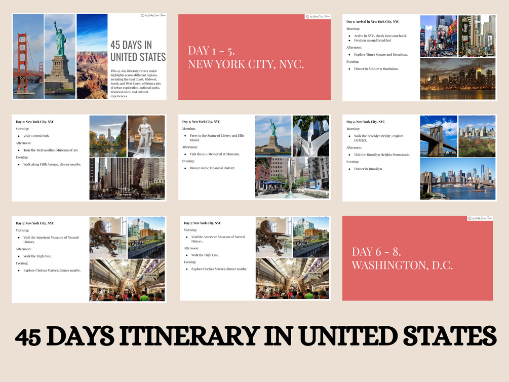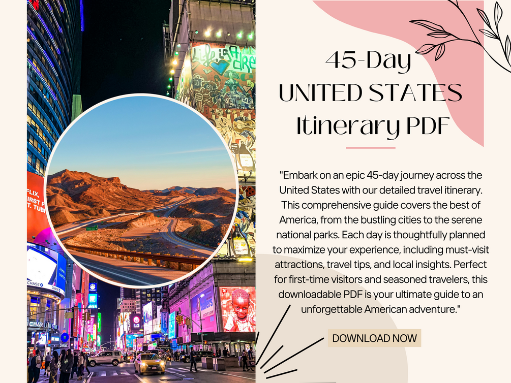 "Embark on an epic 45-day journey across the United States with our detailed travel itinerary. This comprehensive guide covers the best of America, from the bustling cities to the serene national parks. Each day is thoughtfully planned to maximize your experience, including must-visit attractions, travel tips, and local insights. Perfect for first-time visitors and seasoned travelers, this downloadable PDF is your ultimate guide to an unforgettable American adventure."