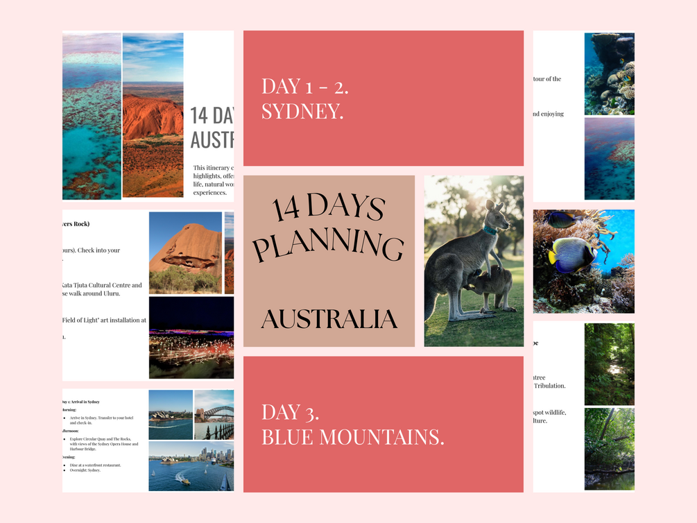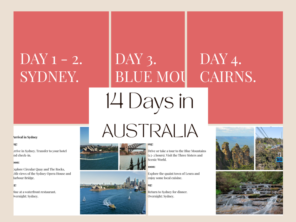 Discover the best of Australia with our expertly crafted 14-day itinerary, designed to give you an unforgettable experience across this diverse and breathtaking continent. Whether you're an adventure seeker, a nature lover, or a culture enthusiast, this PDF guide has everything you need to explore Australia with ease and excitement.