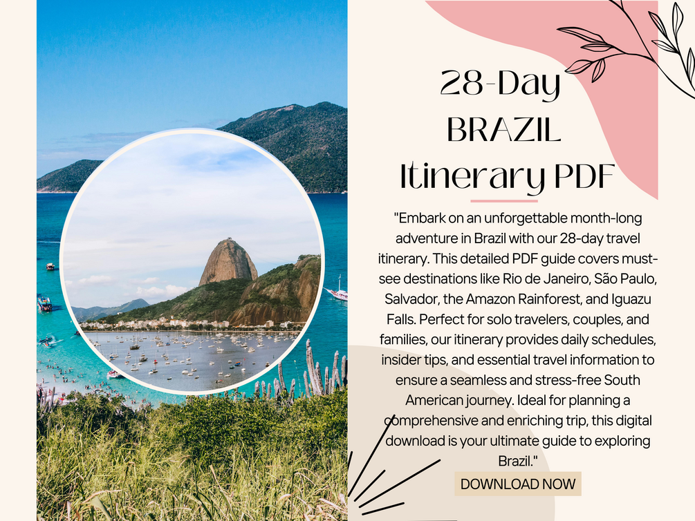 Embark on an unforgettable month-long adventure in Brazil with our 28-day travel itinerary. This detailed PDF guide covers must-see destinations like Rio de Janeiro, São Paulo, Salvador, the Amazon Rainforest, and Iguazu Falls. Perfect for solo travellers, couples, and families, our itinerary provides daily schedules, insider tips, and essential travel information to ensure a seamless and stress-free South American journey. Ideal for planning a comprehensive and enriching trip, this digital download is your ultimate guide to exploring Brazil.
