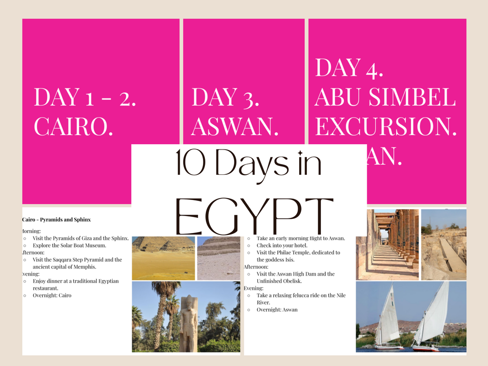 Discover the ancient wonders and modern marvels of Egypt with our 10-day travel itinerary. This detailed PDF guide includes must-see destinations like Cairo, Giza, Luxor, and Aswan. Perfect for solo travellers, couples, and families, our itinerary offers daily schedules, insider tips, and essential travel information for an unforgettable Egyptian adventure. Ideal for planning a seamless and stress-free trip, this digital download is your ultimate guide to exploring Egypt!
