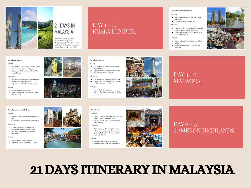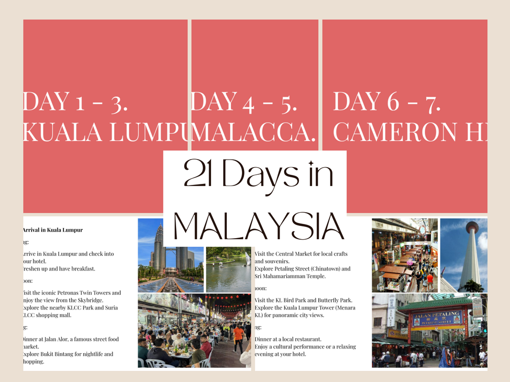 Planning a trip to Malaysia can be overwhelming, but our comprehensive 21-day itinerary makes it stress-free and enjoyable. This printable PDF guide covers all the must-see destinations, including Kuala Lumpur, Penang, Langkawi, and Borneo. Whether you're exploring vibrant cities, relaxing on pristine beaches, or adventuring in lush rainforests, our itinerary ensures you don't miss a thing.