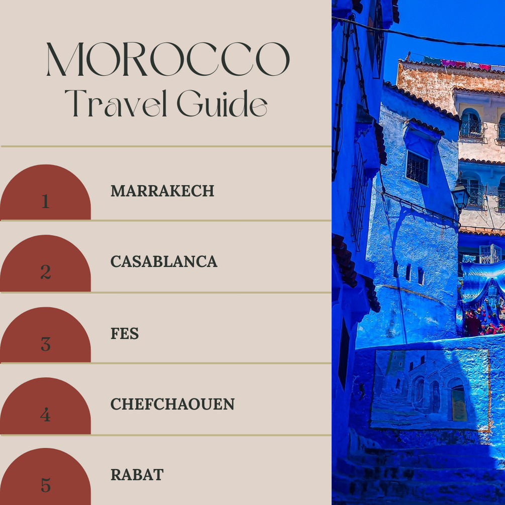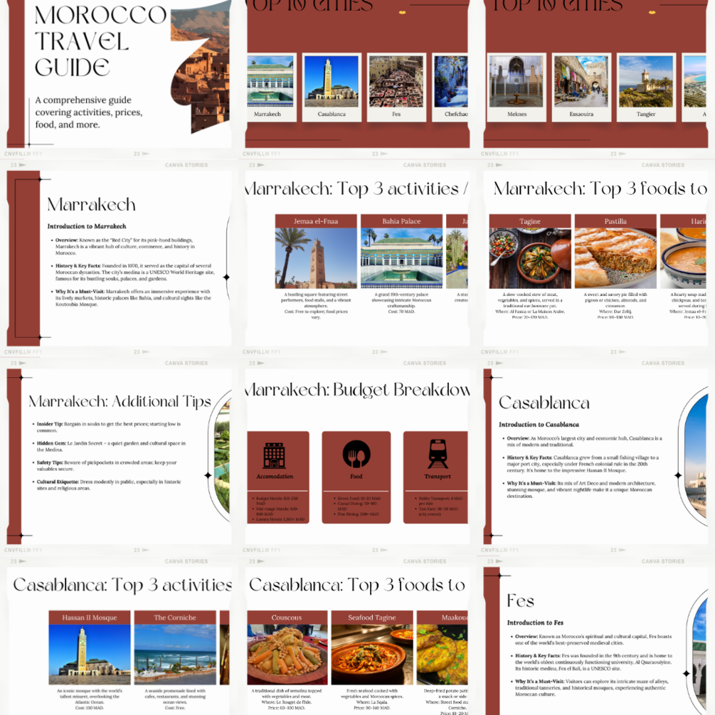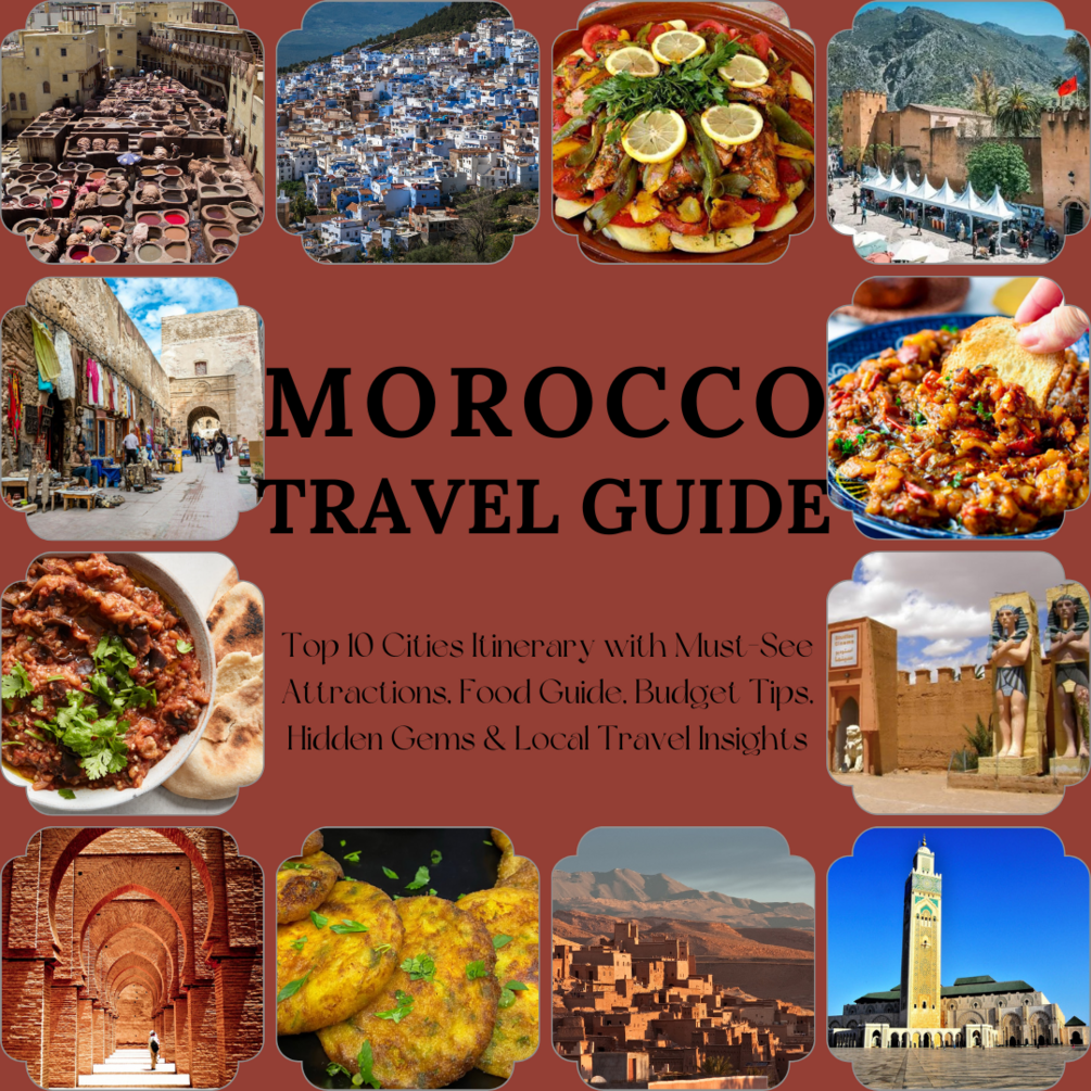 Discover the magic of Morocco with this comprehensive travel guide! Covering top cities like Marrakech, Casablanca, and Fes, this downloadable PDF includes must-see attractions, authentic Moroccan food recommendations, budget-friendly travel tips, and hidden gems. Whether you’re exploring the vibrant souks, desert landscapes, or historic medinas, this guide provides insider tips and cultural insights to make your Morocco adventure unforgettable.