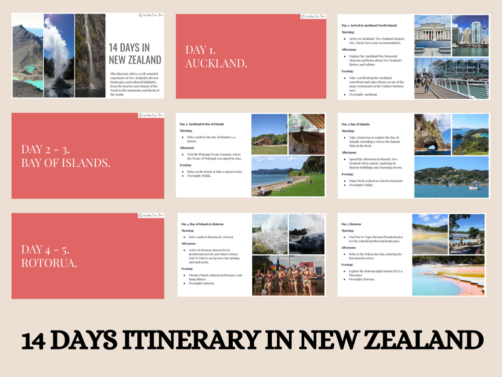You'll get a detailed PDF file - 14-Day Travel Itinerary in New Zealand